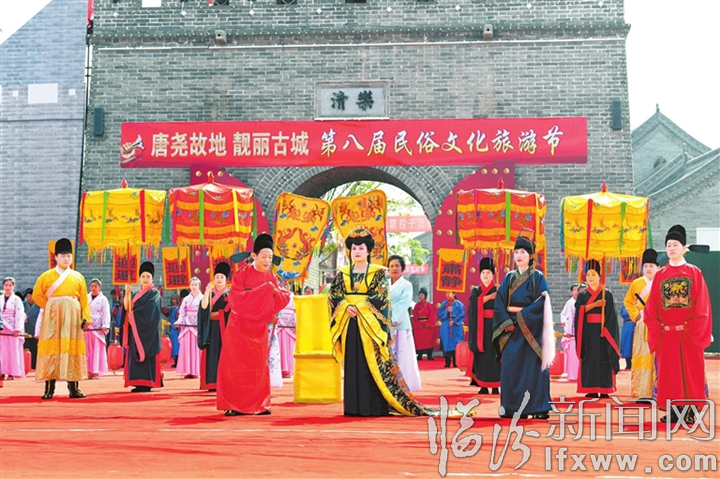臨汾新聞網訊 4月27日,翼城縣唐興鎮古城村第八屆民俗文化旅游節開幕,此次文化節為期5天,旨在展示該村民俗文化和現代文化。圖為村民正在表演大型歷史古裝實景劇《李娘娘還鄉》。