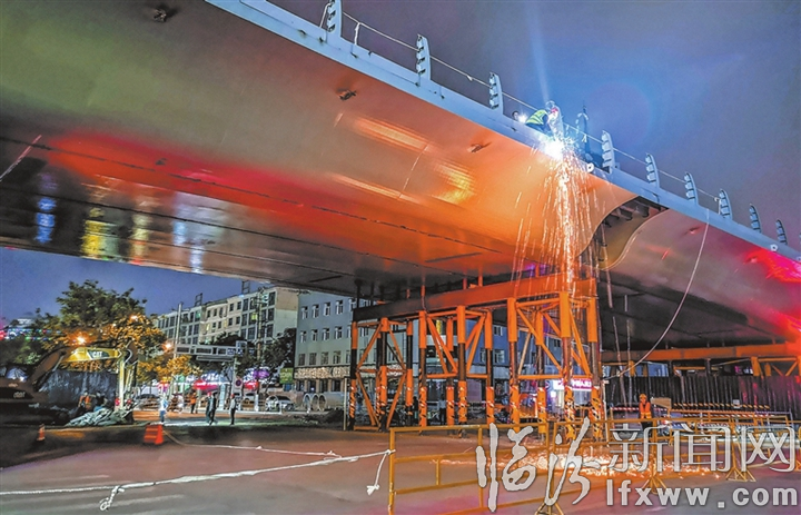 臨汾新聞網訊 連日來,在市區解放東路立交橋項目施工現場,各建設單位倒排工期、晝夜施工,確保如期建成投用。圖為工人正在焊接橋梁護欄。