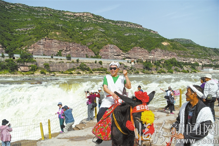 臨汾新聞網訊 隨著氣溫逐漸升高,黃河壺口瀑布近期水量增大,湍急的瀑布奔騰而下,氣勢磅礴,蔚為壯觀,吸引了眾多游客。圖為游客在壺口瀑布景區游覽拍照。