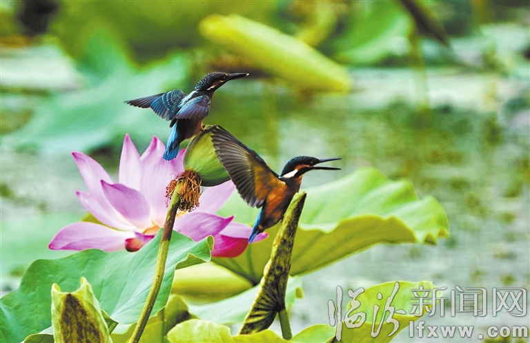 臨汾新聞網訊 夏日,在汾河文化生態景區,爭奇斗艷的荷花迎來一批特殊的“游客”——國家二級保護動物翠鳥。美麗的翠鳥有的在荷塘里飛舞,有的在花蕾上小憩或嬉戲,有的忙著捕食魚兒、喂食幼鳥,給夏日的荷塘增添了靈氣。
