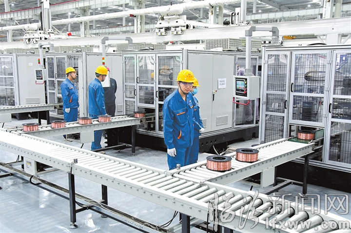 臨汾新聞網(wǎng)訊 近日,曲沃晉南鋼鐵集團(tuán)年產(chǎn)60萬噸金屬材料智能制造項(xiàng)目建成投產(chǎn)。該項(xiàng)目總投資6.69億元,建設(shè)52條鍍銅焊絲生產(chǎn)線、8條鍍鋅鐵絲生產(chǎn)線,可有效減少污染、提高產(chǎn)品附加值及資源利用率。圖為鍍銅焊絲生產(chǎn)線一角。