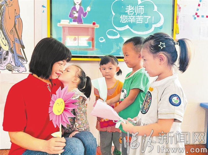 圖為翼城縣古城國學實驗幼兒園的小朋友為老師送上親手制作的禮物,祝老師教師節(jié)快樂。