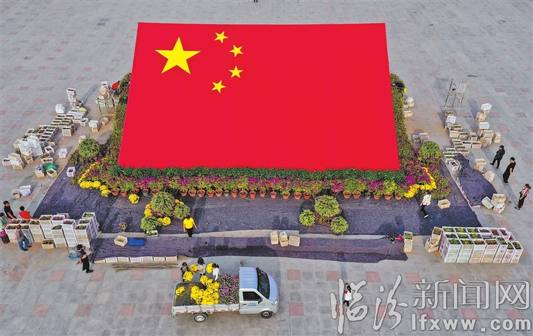 臨汾新聞網訊 隨著國慶節的臨近,我市園林部門因地制宜,結合實際情況設計布置了造型新穎、美觀大方的花壇造型,營造出濃厚的節日氛圍。圖為9月22日,工作人員在市區鼓樓廣場巨型國旗前布置花壇。