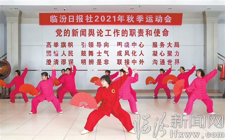 臨汾新聞網訊 為增強員工體質,豐富業余文化生活,10月26日,臨汾日報社舉辦了2021年秋季運動會,參賽選手們進行了象棋、跳繩、乒乓球、趣味撲克等項目的角逐。圖為編輯、記者們在進行太極扇表演。