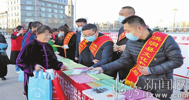臨汾新聞網訊 12月3日,洪洞縣文化和旅游局在縣城中心廣場開展“12·4”國家憲法日法治宣傳活動。圖為工作人員在向來往群眾發(fā)放宣傳手冊、宣講憲法法律知識。 (狐一民 盧高杰 攝影報道)
