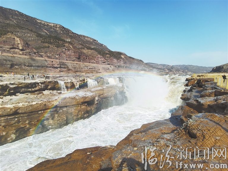 臨汾新聞網訊 連日來,隨著天氣轉暖,冰凌融化,吉縣黃河壺口瀑布水量增大。圖為3月2日,飛流直下的壺口瀑布激起大片水霧,在陽光照射下,出現“彩虹飛渡”的奇觀。