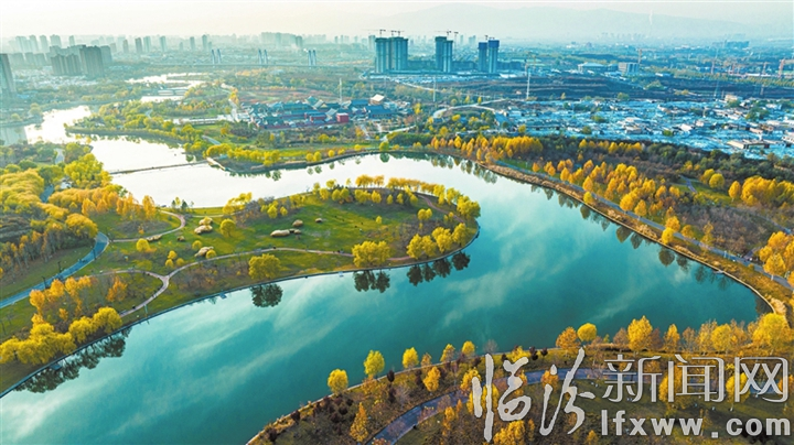 臨汾新聞網訊 近年來,我市規劃建設了澇洰河生態公園,持續加大河道治理力度,進一步改善區域生態環境和居民生活環境。昔日澇洰河荒蕪的灘涂,如今成為市民休閑游玩的好去處。圖為近日航拍鏡頭下的澇洰河生態公園。