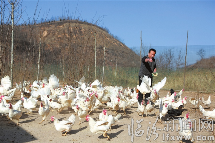 圖為農(nóng)莊負(fù)責(zé)人正在喂食散養(yǎng)的1000只走地雞。
