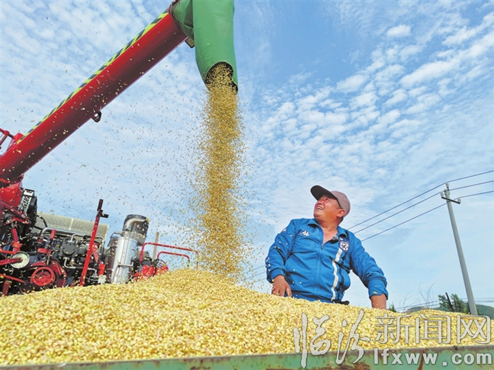 金黃色麥粒從收割機出糧口傾瀉而下。