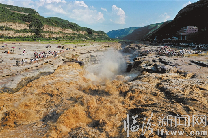 臨汾新聞網訊 近日,游客在吉縣黃河壺口瀑布旅游區游覽觀瀑。受黃河干流晉陜峽谷強降雨天氣影響,吉縣壺口瀑布水量增加,河水顏色由清變濁,再現“大河流金”景觀,吸引了眾多游客。