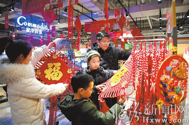 臨汾新聞網訊 2月4日,在市區大豐蔬鮮生活超市,市民在選購福字和節日飾品。春節將至,我市各大商超、批發市場貨源充足、品種豐富、購銷兩旺,“年貨經濟”一派火熱。