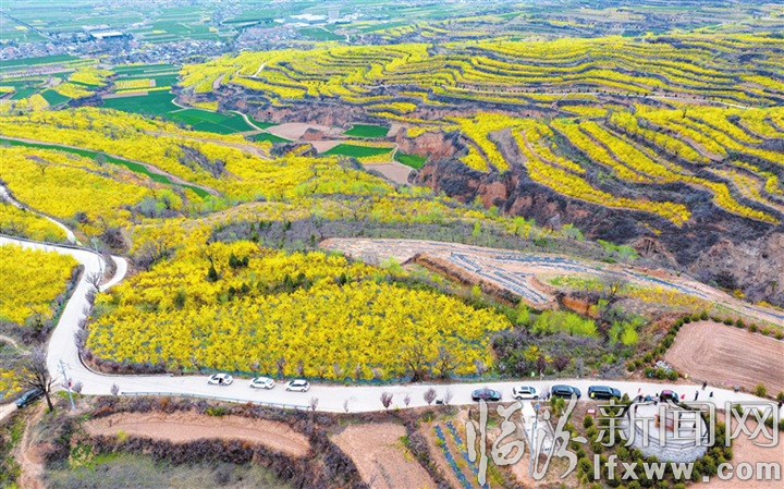 臨汾新聞網訊 眼下,翼城縣南梁鎮2萬畝連翹花迎春盛開。成片的連翹花隨著山勢起伏綿延,燦若金色云霞,一派春意盎然的景象,吸引眾多游人前來觀花海、賞春光。圖為4月1日航拍鏡頭下的南梁鎮連翹種植園區。