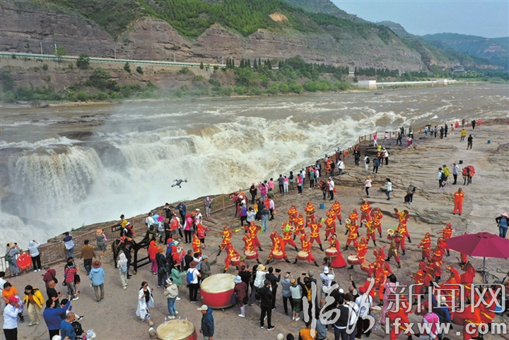 臨汾新聞網訊 近日,民間藝人在吉縣黃河壺口瀑布景區為游客表演威風鑼鼓。