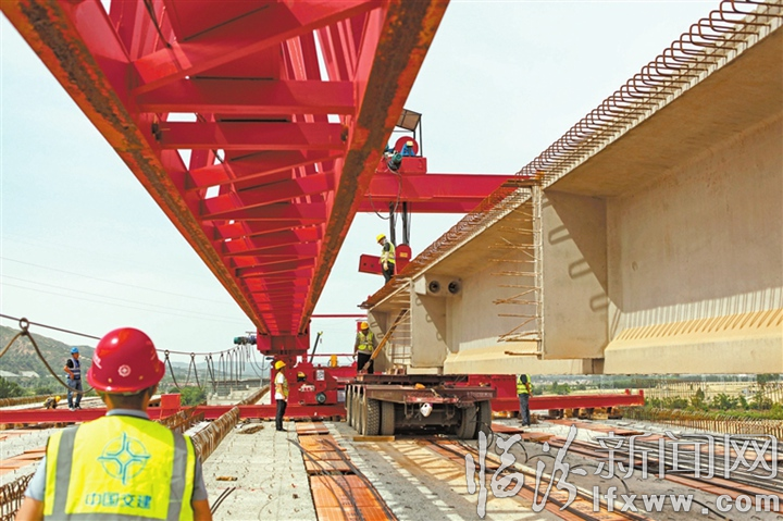臨汾新聞網(wǎng)訊 近日,在侯馬市程村跨線橋施工現(xiàn)場,工人們正進行T梁架設(shè)作業(yè)。