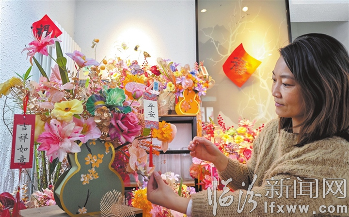 臨汾新聞網訊 新春將至,各類顏色喜慶、寓意吉祥的年宵花成為節前俏銷品,在增添了年味的同時,為人們帶來溫暖和喜悅。圖為市區一家花店的工作人員在制作年宵花。