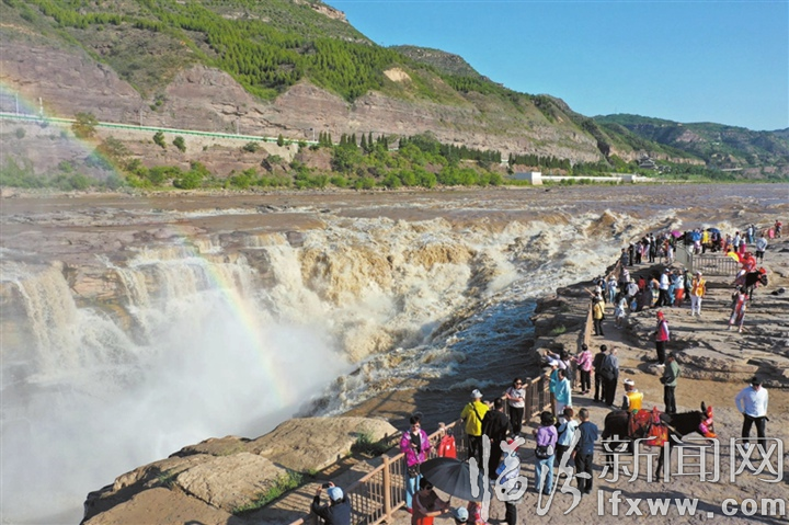 臨汾新聞網(wǎng)訊 6月15日,游客在吉縣黃河壺口瀑布景區(qū)游覽觀瀑。受上游降雨影響,黃河干流晉陜峽谷水量增大,吉縣壺口瀑布再現(xiàn)濁浪翻滾壯美景觀,吸引了眾多游客。