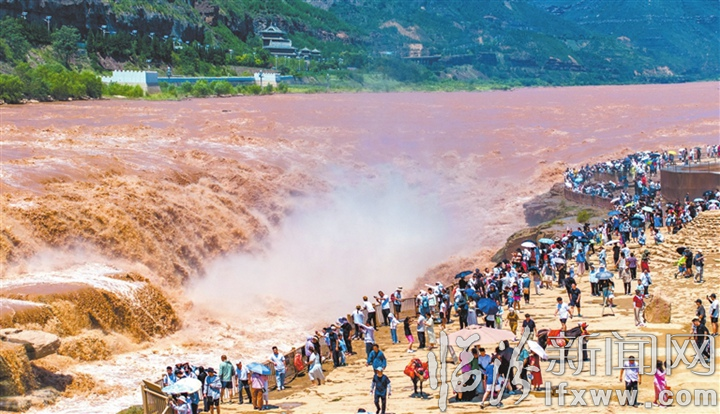 臨汾新聞網訊 8月4日,游客在吉縣黃河壺口瀑布景區觀賞瀑布。連日來,受黃河上中游降雨影響,壺口瀑布水量大漲,形成主副瀑布連成一線的壯美景觀。