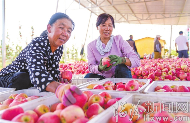 臨汾新聞網訊 金秋時節,吉縣壺口鎮柏東村新品種“美味”蘋果喜獲豐收。圖為9月13日,果農們在分揀裝筐。