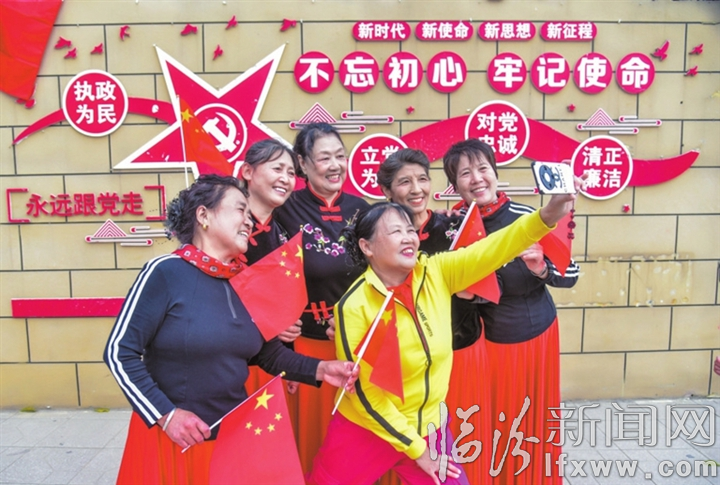圖②為10月1日,霍州市群眾在主題打卡墻前合影留念。 田紅萍 攝