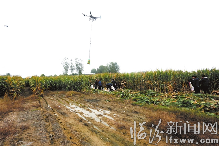 上圖:10月16日,在山西好的糧農業科技有限公司玉米產業園內,來自共青團堯都區委的志愿者正在無人機的協作下搶收玉米。
