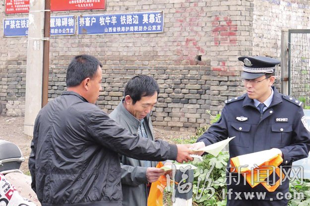 近日,臨汾鐵路公安處民警走進基層,向鐵路沿線居民發(fā)放環(huán)保購物袋及《致沿線居民的一封信》,宣傳愛護鐵路、保障人身安全等相關法律法規(guī)。圖為民警將宣傳品送到居民手中。