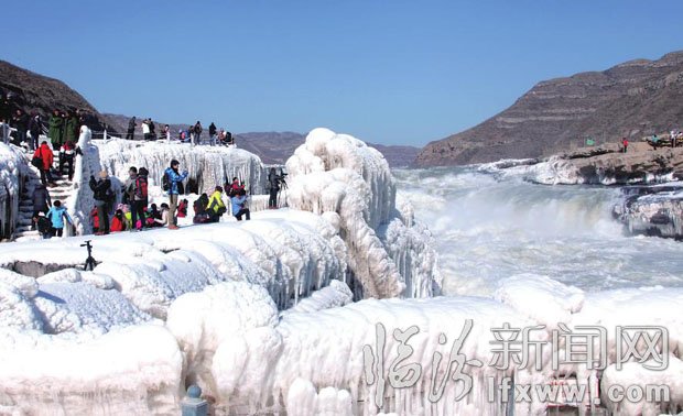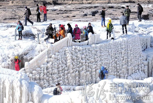 2013年12月29日,游客們在吉縣壺口瀑布景區(qū)游玩拍照。連日來,隨著氣溫的降低,黃河壺口瀑布兩岸形成了長短不齊、形狀各異的冰掛和冰柱,同時,景區(qū)還出現(xiàn)了流凌景觀,吸引了眾多游客和攝影愛好者冒著嚴寒前來觀賞。