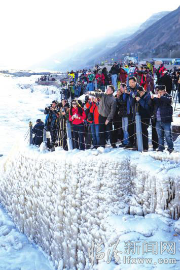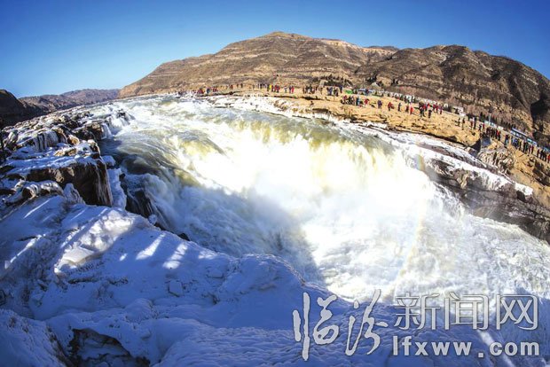 1月4日,黃河壺口景區(qū)內(nèi)熱鬧非凡,兩岸游人用“井噴”形容也不為過。近日,隨著氣溫回升,黃河壺口瀑布兩岸形成了長(zhǎng)短不齊、形態(tài)各異的冰掛和冰柱景觀,吸引眾多游客和攝影愛好者前來觀賞。