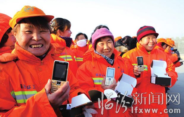 1月3日,我市舉行了“送溫暖,報平安”向環(huán)衛(wèi)工人捐贈愛心手機活動。臨汾電信分公司和臨汾概念傳媒公司為我市1000余名一線環(huán)衛(wèi)工人捐贈了1000余部手機,同時送100元話費,以實際行動關(guān)愛環(huán)衛(wèi)工人,共同營造參與環(huán)衛(wèi)、支持環(huán)衛(wèi)的社會氛圍。圖為我市環(huán)衛(wèi)工人高興地展示自己領(lǐng)到的愛心手機。本報記者 閆銳鵬 攝