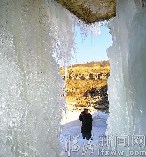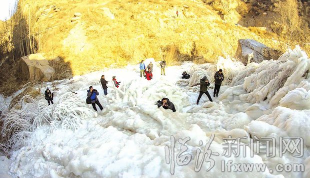 圖為山西臨汾攝影家協(xié)會(huì)會(huì)員在陜西宜川一冰瀑下拍攝照片。