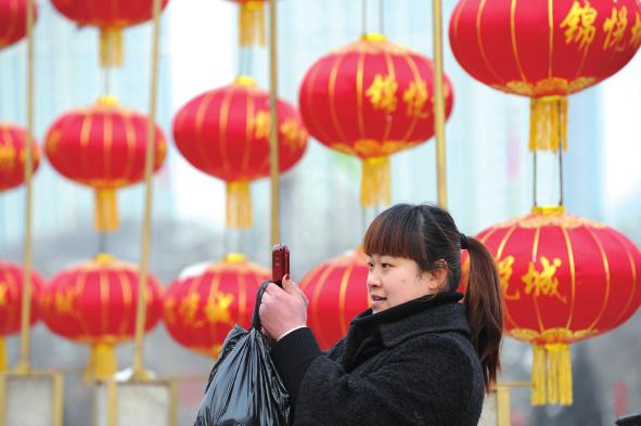 市民們在紅紅的燈籠群中穿梭、留影,享受著紅火美好的假日。
