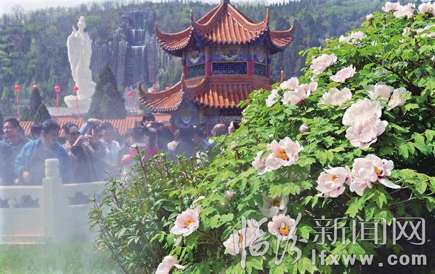 4月27日,游客在古縣牡丹園觀看水霧牡丹景觀。當日,由山西宇坤夢特貿易有限公司承辦的第七屆古縣牡丹文化旅游節暨第二屆全民健身運動會開幕。期間將舉辦“詠牡丹”游人現場書寫書法、戲曲表演、自行車賽等,為“五一”假期游客提供一道旅游“盛宴”。本報記者 李虎威 攝