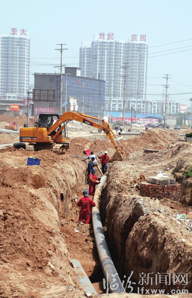 5月20日,在堯都區二中路拓寬改造工程項目建設工地,工人們正在安裝天然氣管道。二中路改造工程全長1738.628米,起點解放路立交橋東,終點至北內環,道路紅線寬度60米,兩側綠線各寬10米,雙向八車道。拓寬改造工程按城市主干道標準設計,是堯都區重大基礎建設工程。