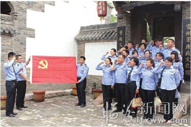近日,霍州市司法局組織全體黨員干部參觀霍州署廉政文化館,積極加強黨風(fēng)廉政建設(shè)和反腐倡廉教育。圖為該局全體黨員干部在黨旗下莊嚴(yán)宣誓,重溫入黨誓詞。本報記者 范韶華 攝