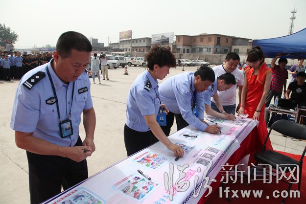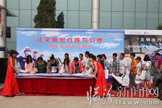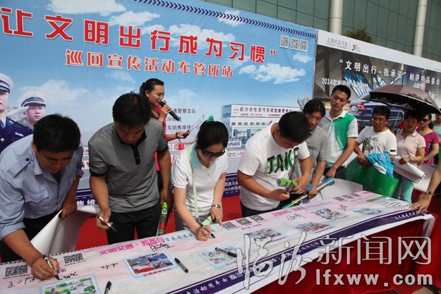 5月27日上午9時,由臨汾市文明辦、臨汾市交警支隊聯合黃河新聞網舉辦的“讓文明出行成為習慣”巡回宣傳活動第三站,走進了臨汾市交警支隊車管所進行巡回宣傳,活動現場,廣大交通參與者在“文明出行·我承諾”的簽名墻上承諾簽名。