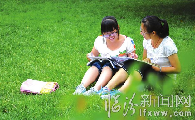 高考即將來臨,我市各中學已陸續(xù)開始安排考生進入考前自主調整期。圖為6月4日幾位考生在城市綠茵下對備考的筆記和試卷進行總結復習。