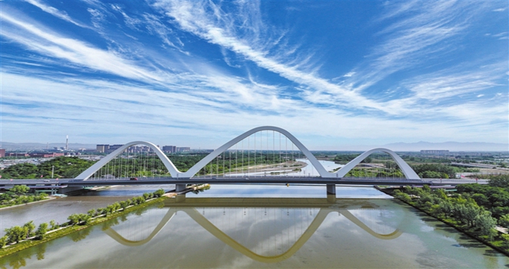 6月4日,市區姑射橋在藍天白云映襯下秀美壯觀。連日來,仰望蒼穹,碧空如洗,藍天、白云與綠水、青...