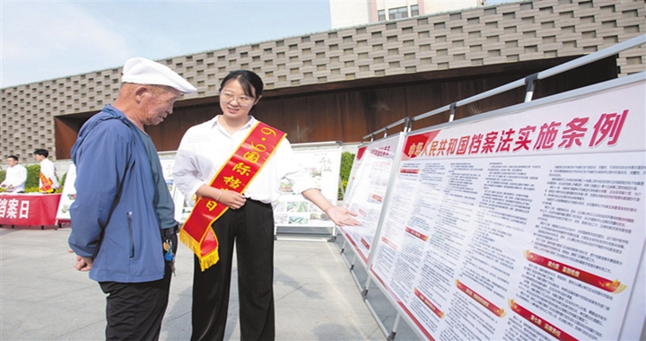 6月10日,在市區平陽廣場,市檔案館的工作人員在向市民講解臨汾檔案歷史。連日來,“請聽檔案說——...