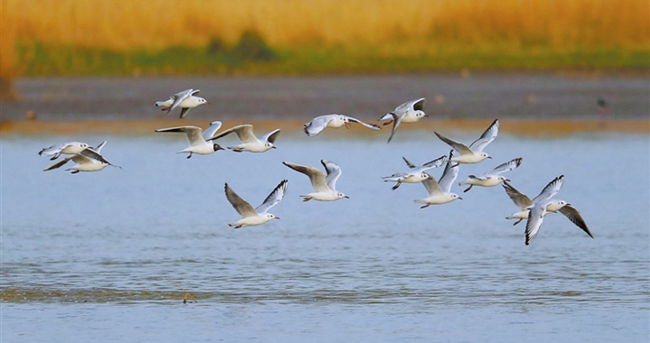 4月24日,在汾河臨汾市城區段水域內,海鷗、灰雁、鴛鴦等水鳥在河面上游弋覓食。近年來,我市積極落...