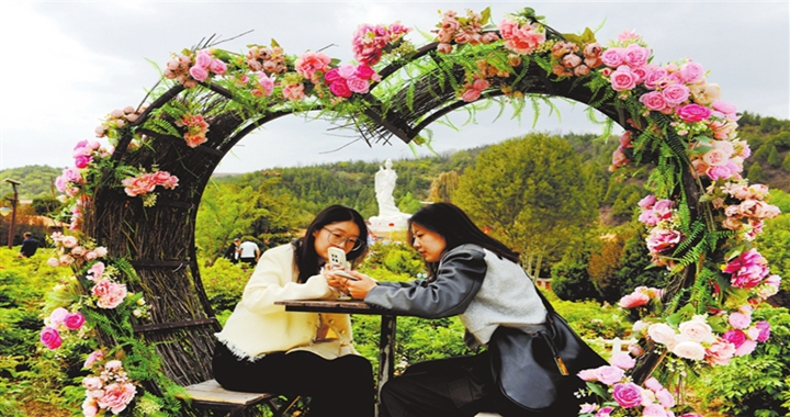 4月29日,游客在古縣牡丹文化旅游區拍照打卡。在古縣第十八屆“天下第一牡丹”文化旅游月系列活動中...