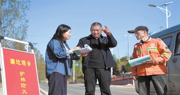 5月7日,在浮山縣寨圪塔鄉石口村森林防火檢查點,值守人員在為過往司乘人員講解防火注意事項。隨著旅...