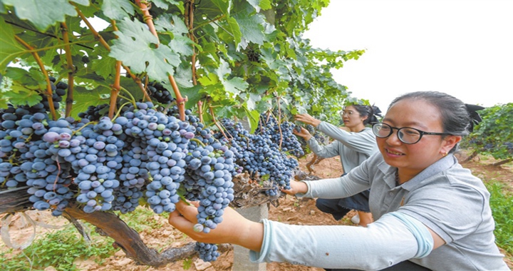 8月21日,在襄汾縣堯京酒莊葡萄種植基地,技術人員在檢查葡萄長勢。眼下,堯京酒莊3500畝釀酒葡萄進...