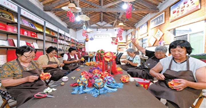 8月28日,在襄汾縣趙康太平繡球文化產業園內,農家婦女在制作太平繡球。襄汾縣通過創辦專業合作社和...