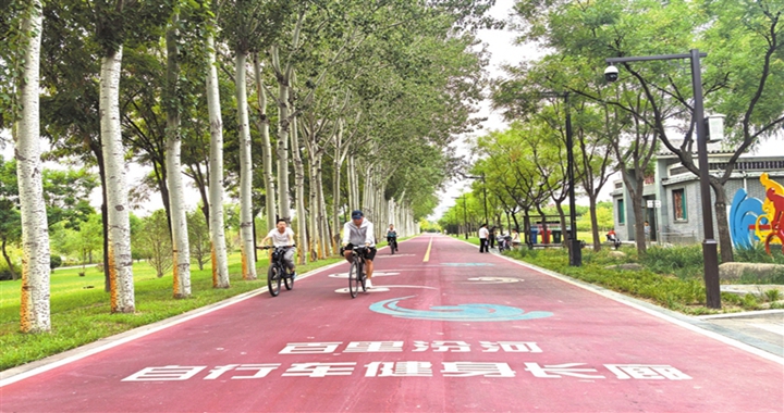 8月10日,市民在市汾河文化生態(tài)景區(qū)百里汾河自行車長廊棋閣廣場段騎行鍛煉健身。據(jù)悉,臨汾百里汾河...