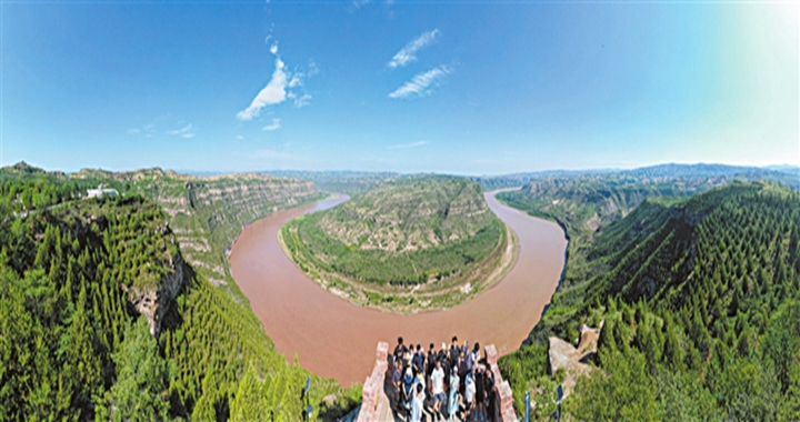 8月19日,游客在永和黃河乾坤灣景區(qū)游覽。近年來,永和縣不斷提高黃土高原的森林覆蓋率,從新中國成...