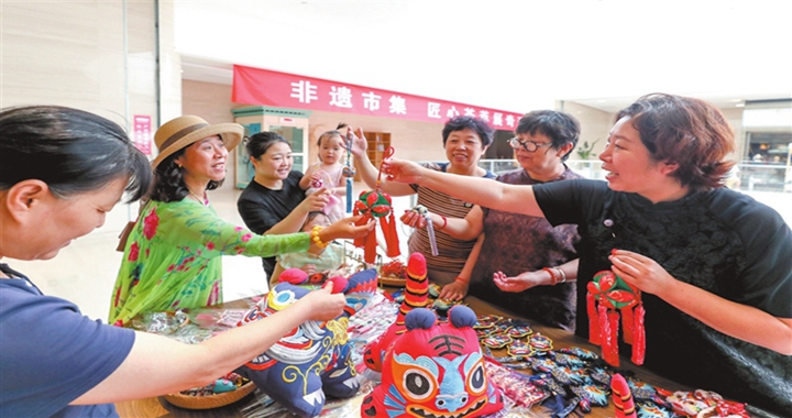 7月20日,在臨汾市博物館的非遺市集上,市民在挑選非遺文創產品太平繡球。臨汾市博物館“守遺煥新 臨...