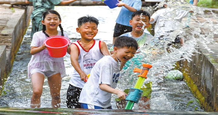 7月20日,在堯都區一家農家樂溪水營地,孩子們在打水仗。盛夏時節,高溫持續“在線”,我市一些游泳...