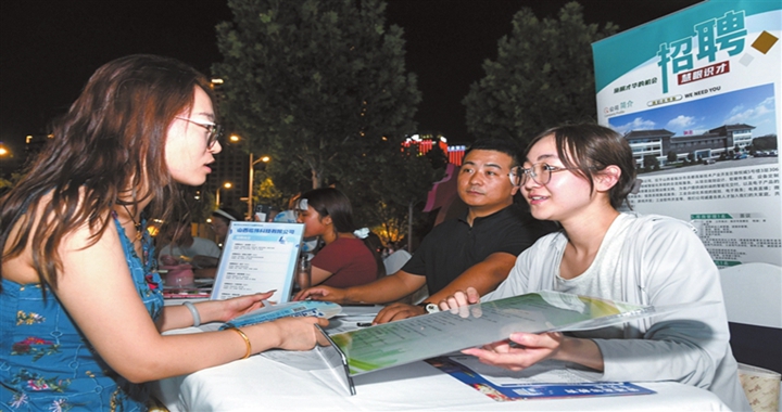 7月25日晚,在市區萬達廣場,求職者在和用人單位交流洽談。當日,臨汾市第二場“人才夜市”招聘會舉...