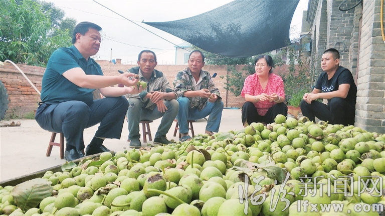 又到了核桃收獲的季節(jié),張王平在村里的盛昌垣核桃專業(yè)合作社門口,與合作社成員們討論今年核桃收獲的情況,為合作社發(fā)展出謀劃策。