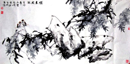 其三,他的技法有些創意:中國畫的傳統之一是勾線、線描,而陜有峰的葫蘆、石榴、紅果諸形,則摒棄此法,全以暈染成之;這當然很難說是他獨有的創新,但相比于同樣畫這類形象而以勾線為之者,則不能不說有新意。尤可注意者,他以暈染完成的這類景致,似乎還多少想到不同光源所造成的明暗效果。另外,他以濃墨和枯筆的揮灑,讓人多多少少還感覺到某些西畫味道和現代氣息,這是他應該發展的。