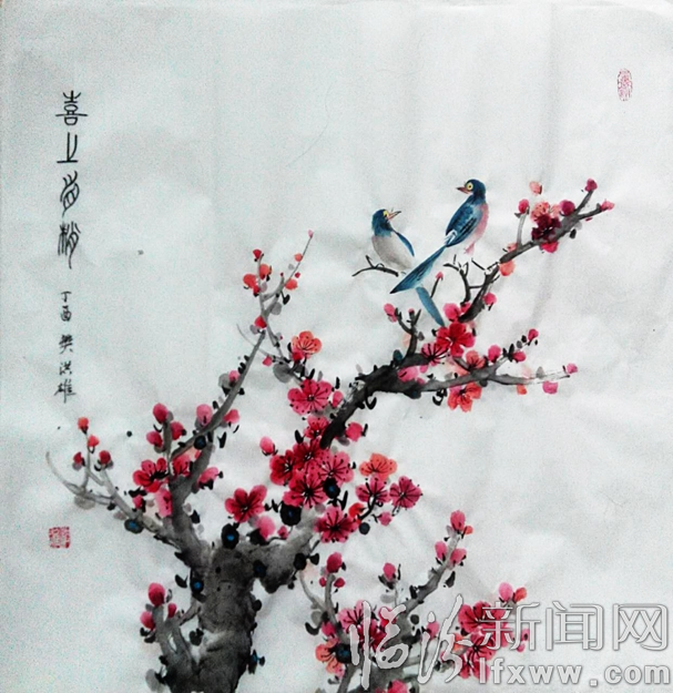 花開(kāi)俊俏,喜上眉梢。鵲鳴枝頭,好運(yùn)來(lái)到
